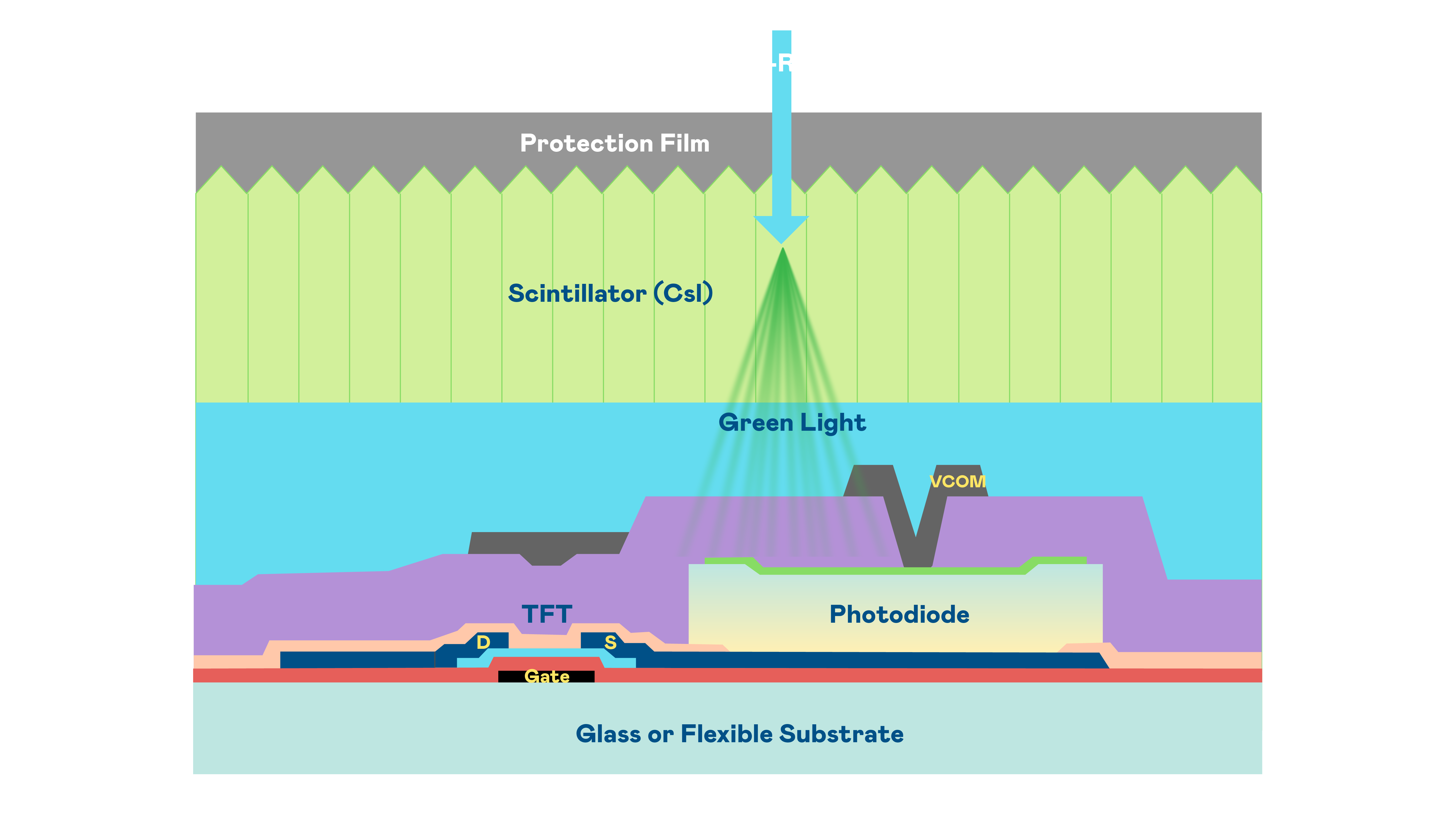 ag尊龙凯时的X光影像感测阵列使用薄膜电晶体 (TFT) 作为每个像素的读取开关,搭配光电二极体(Photodiode)的光电转换元件,用以感测X光影像讯号。